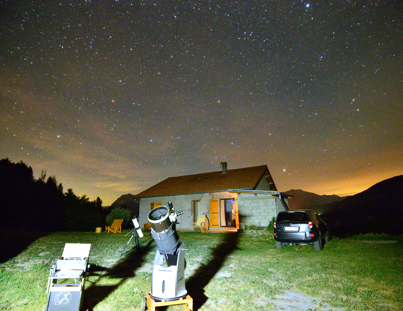 – Ne prenez pas de lampe torche puissante mais plutôt une lampe led rouge si possible. cela permettra de mieux conserver la vision nocturne qui s’installera au fur et à mesure de la soirée. 30 minutes minimum sont nécessaires afin que l’œil s’habitue à l’obscurité. Avant cela, vos capacités sont réduites et la moindre lumière ne fera qu’augmenter ce temps d’adaptation… Votre lampe blanche vous servira pour retourner sans encombre dans votre logement ! – Habillez-vous avec des vêtements chauds ! En montagne, même si les journées sont douces, la température baisse fortement la nuit. Vos extrémités sont vites froides ! Polaires, bonnes chaussettes sont conseillées pour ne pas avoir à écourter la soirée ! In order to spend a nice evening together under a celestial vault, it is better to be well equiped.