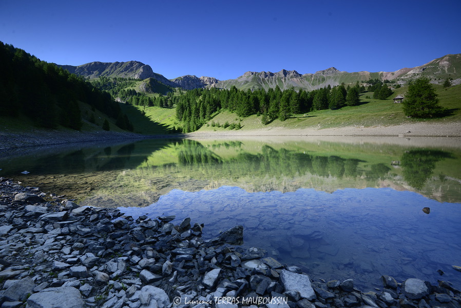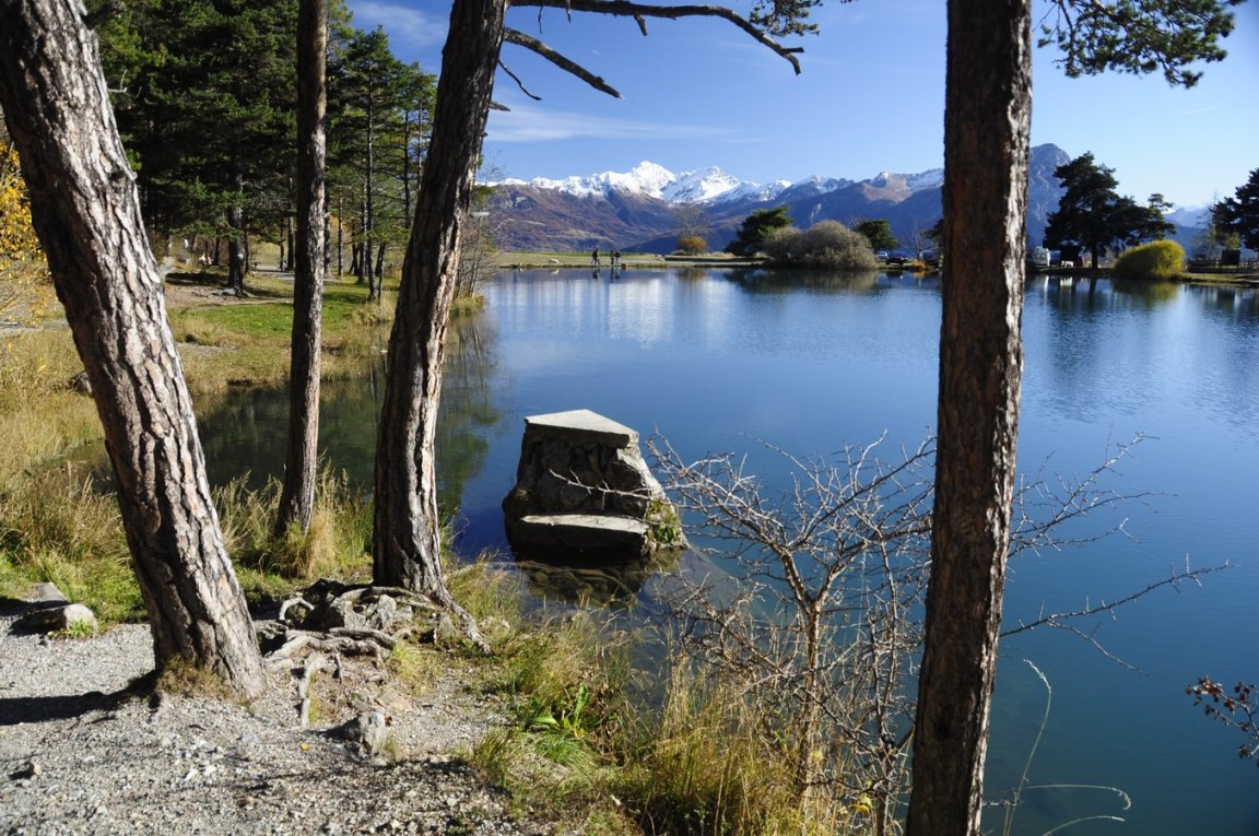 Lac naturel qui invite à la baignade, la pêche entouré de pins depuis lequel la vue sur le lac de Serre-Ponçon et le massif du Morgon est immanquable.